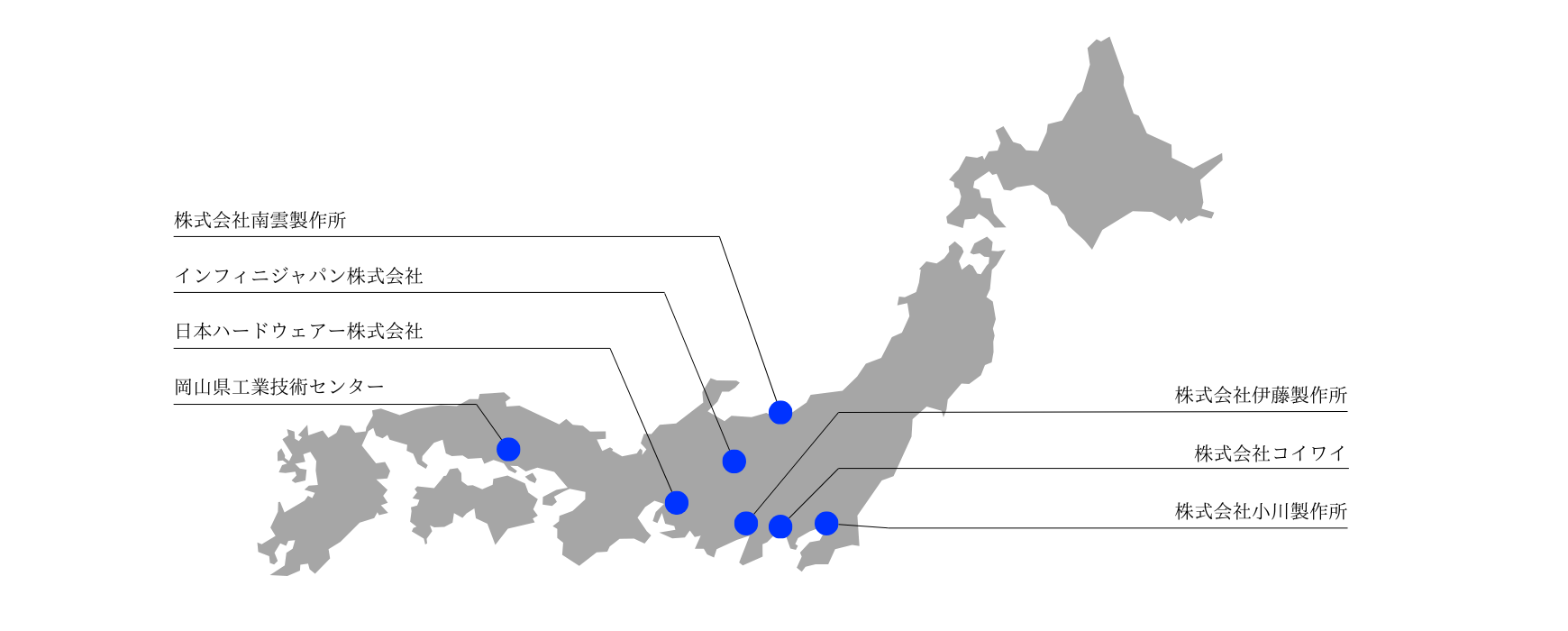 株式会社南雲製作所:WC超硬合金/金型部品製造領域 株式会社伊藤製作所:精密分析検査ノズル領域 インフィニジャパン株式会社:受託表面処理加工領域 株式会社コイワイ:Metal AM部品製造領域 日本ハードウェアー株式会社:鍛造金型製造領域 株式会社小川製作所:半導体超精密機器/部品製造領域 岡山県工業技術センター:共同研究先